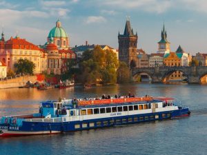 Круїз по романтичній річці Влтава з харчуванням в формі “шведського столу” (30€). Вид на річку Влтава з оглядової палуби круїзного корабля є одним з улюблених туристичних розваг. Екскурсія по Влтаві – ідеальний варіант для знайомства з панорамами Праги в комфортній обстановці.